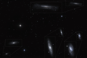 Sziasztok! Ez az első SHO felvételem. Korábban csináltam már ilyen ál-SHO-t HOO sorozatból a 6D-vel, de végre összeállt ez a másik rendszer, amivel szeretnék galaxisokat, planetárisokat, meg apró kiterjedésű objektumokat fotózni. HEQ5-höz képest nagyon jól működik a szett. Esetleg meridián flipnél mozdul be egy fotónál, de szépen viszi a 10 perces expókat. Van ZWO LRGB szűrőszett is, ám megpróbáltam cserélgetni váltáskor mert nincs szűrőváltó ( még ) ... hát hirtelenjében nem sikerült beállítani jól a záridőt, ezért az RGB csillagok alulexponáltak lettek, így kikevertem pixelmatekkal egy mesterséges színű csillagmezőt. A galaxisnak még lehetne fényesebb a magja, de kicsit levettem a fényerejét. A feldolgozásnál nekem az hozta a legszebb eredményt, hogy HOO-ként kezdtem a képet és arra ment rá raszterrel az aranyszínű SII réteg. Őszintén szólva nem gondoltam, hogy ilyen részleteket sikerül kihozni a látómezőből. Például fél 11 óra irányában az a buborék... planetáris-köd? vagy SN? És jobbra lent 5 óránál mi az a virágszirom? :D Nagyon menő, egyszerűen új távlatokat nyit a műszer számomra. Van ugye a 750mm-es 294-es látómező, de azon ez csak egy aprócska folt... Így szerintem a 800mm az 585 szenzorával nagyon ütős keskenysávban. Jó persze egy 1200mm kellene 30 centivel és APS-C-vel de hát ahhoz kell pénz a lóvéra is. Személy szerint nagyon örülök, hogy ilyen felvételt sikerült készítenem. Nem veszi fel a versenyt a nagy trökkoppányi együttes sorozatfelvétellel, de közel áll hozzá. :)