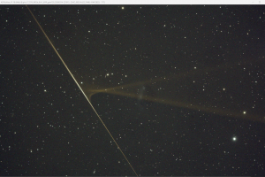 Az IC2574 fotózása közben rögzítette ezt a különleges Meteort a kamerám. Én még ilyet nem láttam, így a Közös Észlelés Chat-ban érdeklődtem meg, hogy mi ez? Rafi írta meg, hogy Meteor. Látszik a füstje ahogy jobbra elfújja a felsőlégkör. Másnap reggel a képek átnézése folyamán bukkantam rá, amit természetesen nem töröltem. Ez az eredeti nyers .fit képkivágással készült képe.