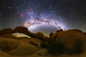 Tovább az észleléshez »Mindennapi életünkben a tájelemek megszokottak... ott voltak, ott vannak és ott lesznek, legyen ilyen például a Badacsony, vagy éppen a Grand Canyon és még lehetne sorolni sokáig. Számunkra a csillagos égbolt is állandó. A csillagképek ugyanott vannak az éggömbön, a Tejút szintén, csupán a Föld forgása és a Nap körül keringése miatt látunk mindig más és más érdekességet az égbolton. Azonban több ezer év múlva a számunkra állandó dolgok megváltoznak. Elkezdenek deformálódni a csillagképek, elkezdenek vándorolni a csillagok az égen... lent dolgozik az erózió és ezek a kőelemek is elkopnak millió évek múlva. ... Azok a kőrakások, melyek számunkra igazán különleges látványt nyújtanak. Namíbiában a kopasz gránitcsúcsok több száz méterrel törnek a csillagos égbolt felé, melynek a fénye éjszakánként megderíti ezeket a sziklákat, kellemes sárgás fényt adva, melyet az emberi szem éjjel sajnos nem érzékel. A Spitzkoppe csúcsai, nevezetességei közül talán a legismertebb a képen látható kőív - The Rock Arch - melyet a z odalátogató turisták lámpáinak kereszttüzében sikerült egy 100 képes panorámafotón megörökíteni. Mivel egy kósza lámpafény is elronthatja a panorámát, ezért itt sajnos gyorsan kellett fotózni kis kompromisszummal. A képek egyenként ISO6400, f2.2, 10sec, 35mm-en készültek, melyet a panorámafej végigfordított, de ígyis többszöris meg kellett állni felvételkészítés közben a zavaró fények miatt. Ha ez nem lenne elég, akkor egy 2,5 x 2,5 méteres nagy, de legalább gömbölyded sziklán egyensúlyozva készült a panoráma, tehát nagyon mozogni se kellett, nehogy véletlenül az állvány megmozduljon.