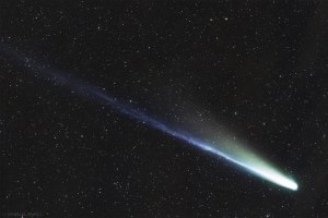 Tovább az észleléshez »Korábban sikerült készítenem egy holdfényes, fátyolos verziót az üstökösről. Most viszont a holdfénymentes kristálytiszta derültben exponáltattam a távcsővel egy sorozatot. A kompozíciót most így hagytam, hogy szépen balra felfelé menjen az üstökös, holott jobbra le megy amúgy. Nagyon érdekes és a nyerseken is látszódott, hogy alul van egy sötét sáv. Feldolgozáskor külön ügyeltem a gradiensekre, mind a sötét sávot, mind a kómát békénhagyva. Ha jól gondolom, akkor a kép közepén az üstökös fényes részéből egy adag felénk terül el és ahogy süt a Nap, az valószínűleg árnyékot vethet arra a fátyolra, ami előtte van és a Föld környékére terül szét. Az animációk alapján erre a következtetésre jutottam. Hetekig szenvedés volt az időjárást illetően, de ez az este mindenért kárpótolt. :)