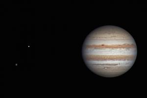 Tovább az észleléshez »Tegnap este 3 különböző időpontban próbálkoztam a Jupiterrel. A harmadik időszakban lett két egyperces felvétel, ami alatt elég jól lenyugodott légkör. A két holdat 10 perccel később kameráztam le, és utólag tettem fel a három égitestet egy képre.