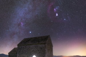 Egy csendes, eldugott és igazán sötét helyet kerestem a téli Tejút megfigyeléséhez, így akadtam rá a Harasztipusztai templomra, Herencsényen. Olyan mértékben sötét itt az égbolt, hogy az Orion halványabb ködösségeit is sikerült megörökítenem, többek között a Barnard-ívet, a Boszorkányfej-ködöt és a Lófej-ködöt. A templom felett a Sirály-köd is szépen kirajzolódik, míg a kép tetején, a Tejút sávjában a Rozetta-köd világít.