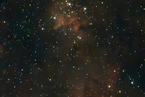 2025.05.24-27 között Namíbiában, az Isabis-völgyben készült felvételem az Hajógerinc (Carina) csillagképben található, IC 2599 katalógusszámú "Gabriela Mistral-ködről". A felvételen látható még a ködösség által körülvett NGC 3324 nyílthalmaz és a kép jobb felső sarkában megfigyelhető NGC 3293 nyílthalmaz is. Itthonról nem figyelhető meg, jóval délebbre kell utazni érte. A felvétel készítéséhez keskenysávú szűrőkészletet használtam, a képeket a Hubble-paletta szerint dolgoztam fel. A felvétel bal alsó sarkában a Carina-köd külső területe látszik, redős-ráncos ívként. Középen látható maga az IC 2599 emissziós köd, középen oxigénben gazdag, kékes-ciános színű terület, amit a hidrogénben gazdag külső burok vesz körül. A belső régió egy jobbra néző, magas homlokú fejformára hasonlít. Hasonlóságot mutat Gabriela Mistral Nobel-díjas költő arcával, innen kapta nevét. A köd magába foglalja az NGC 3324 nyílthalmazt, aminek anyagából születtek csillagai. Az oxigénben és hidrogénben gazdag területek határvonaláról készített képet a James Webb űrtávcső, "Cosmic Cliffs" címen, ami az egyik legismertebb felvétele lett. A kép jobb felső sarkában megfigyelhető az NGC 3293 nyílthalmaz: A halmaznak több mint száz tagja van, többségben fiatal kék csillagok és néhány vörösesebb is. Trapéz alakja van, nagyobb tagjai a halmaz közepében vannak, a kisebbek kívül. Csillagai közötti távolság nagyjából egyenletes. Ezt a halmazt is körbeveszi egy emissziós köd, aminek szálas szerkezete van, közepén az oxigén dominál kékes színnel. Az NGC 3324-et James Dunlop fedezte fel 1826-ban, távolsága a Földtől 9100 fényév, átmérője 15 fényév. Az NGC 3293 halmazt Nicolas-Louis de Lacaille fedezte fel 1751-ben, távolsága tőlünk 8400 fényév, sugara 13 fényév.