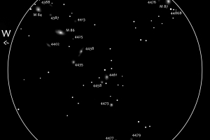Tovább az észleléshez »23:52-23:59 UT 15 mm 70° SWA okulár -> 80x nagyítás, 53' LM 80x: az M 60 a legfényesebb, a peremén lévő NGC 4647 könnyen megfigyelhető. Középen az NGC 4638 virít. A rajzon a kompakt IC 809 van legészakabbra. Fél LM-mel arrébb (ÉNy) két éléről látszó GX figyelhető meg, egymással majdnem párhuzamos, de eltérő szélességű és fényességű sávok.