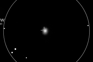 Tovább az észleléshez »16:44-17:04 UT 35 mm 56° okulár -> 34x nagyítás, 98' LM Kóma átmérője: 6' Sűrűsödési fok (DC): ~5 Csóva mérete: 600' PA: 70° Horizont feletti magasság: 20° Szabad szemmel a csóva megvan 10 fok, ebből 5 nagyon könnyen látszik. 10x50B: teljes LM (6,8°). 15T, 34x: kb. 1 LM-ig lehetett követni. Magot középre helyezve egyetlen csillag látszik (7,4 magnitúdós HD 76031), annál azért fényesebb a mag. Kicsivel arrébb a csóva mellett látszik még két 6,5 magnitúdós csillag. A kóma 80x nagyításon még tovább fényesedik befelé, középen az álmag már teljesen csillagszerű. A csóva a kóma közvetlen közelében nagyon fényes, az üstökös eddig harang alakúnak látszik. Innen távolodva hirtelen csökken fényessége, az LM szélén már nehéz észrevenni, de onnan már lassabban halványodik. A ellencsóvában nagyon bizonytalan vagyok, inkább nem látszik, mint igen. Ha azt látom, akkor vékonyabb és rövidebb, mint a fotókon. Megjegyzés: Okt. 15-én láttam először 16:50 UT-kor, csak szabad szemmel akkor, de a látvány lenyűgöző volt. A távcsöves észlelés helyéről mindössze 20 percig volt megfigyelhető az üstökös, és úgy is csak elég kényelmetlenül. A rajz digitális, kinti vázlat alapján készült. Annyira nem tetszik az eredmény, de most ennyire tudtam csak elmélyedni benne. Úgy tűnik, reflexből véletlenül a mélyéghez került a rajz.