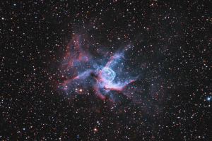 Tovább az észleléshez »2023.06.15-én és 16-án Namíbiában, az Isabis-völgyben készült felvételem a Skorpió csillagképben található, NGC 6357 katalógusszámú "Homár-ködről". Itthonról nem figyelhető meg, Namíbiában viszont a zenitig emelkedik. A fénykép elkészítéséhez monokróm kamerát és keskenysávú, hidrogén és oxigén szűrőket választottam. A ködösség a nevét a felülnézetből látható homár formájáról, és vörös színéről kapta. A kép alján, a két görbe nyúlvány emlékeztet a homár ollóira. Csak nagyon kevés oxigént tartalmaz, hidrogénből sokkal több van a ködösségben, ezért ilyen erősen vörös színű. A köd egy csillagkeletkezési régió, gyors ütemben születnek új csillagok a ködöt alkotó hidrogénből. 6 000 fényévre található a Földől, átmérője 400 fényév körüli. A ködösség tartalmazza a Pismis 24 nyílthalmazt, ami az általunk ismert legnyagyobb tömegű csillagokból is tartalmaz néhányat.