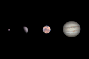 Tovább az észleléshez »Úgy gondoltam, hogy összegyűjtöm egyetlen képbe a korábban, más-más időpontokban és helyszíneken készült bolygófotóimat egyetlen Naprendszermodellé. Az első felvételem 2018. 07. 27-én készült a Vénuszról, az utolsó 2022. 03. 14-én a Napról. A bolygókről 200/800 Newton tubussal, Televue 3X-os Barlow-lencsével és ASI 224MC típusú bolygókamerával készítettem a felvételeket, a Napot egy Lunt 35mm-es naptávcsővel és egy ASI 294MM monokróm kamerával fotóztam le. Az egyes képek készítésének helye, ideje: Nap: 2022.03.14. Zalaegerszeg Merkúr: 2019.02.22. Zalaegerszeg Vénusz: 2018.07. 27. Dobronhegy Mars: 2020.10.22. Dobronhegy Jupiter: 2020.07.20. Őrimagyarósd Szaturnusz: 2020.07.20. Őrimagyarósd Uránusz: 2018.12.27. Zalaegerszeg Neptunusz: 2018.12.27. Zalaegerszeg