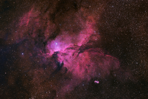 Tovább az észleléshez »A kiváló hangulatú, Őrimagyarósdon megrendezett táborozás során fordítottam a tubusom a "Pacman-ködként" is ismert emissziós köd irányába. A felvételt hamisszínes eljárással, a Hubble-paletta szerint dolgoztam fel. A szabálytalan kör alakú, főként hidrogénből és oxigénből álló ködösségben egy sötétköd figyelhető meg, ez alkotja a Pacman-köd száját. Az IC 1591 katalógusszámú fiatal, néhány millió éves nyílthalmaz is látható benne, ami a köd anyagából született és ionizálja azt, emiatt láthatjuk. A nebula peremén láthatóak a Bok globulák, melyek valójában a hidrogénfelhő sűrűbb részei, ezért ellenállnak a nyílthalmaz csillagszelének, leárnyékolva a mögöttük lévő térséget. Kedvező esetben a globulákból újabb naprendszerek keletkezhetnek. Edward Barnard fedezte fel 1881. november 16-án a 9500 fényév távolságra lévő, 96 fényév átmérőjű ködösséget.