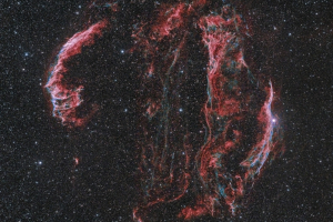 Tovább az észleléshez »A korábbi képemet dolgoztam fel újra az elejétől. Ezúttal a keskenysávú képekből származnak a csillagok is. A csillagmezőt is sikerült visszafognom. 2023.08.12-étől 18-áig, a VCSE Ispánkon megrendezett táborában készített felvételem a Hattyú csillagképben található Wolf-Rayet 134 szupernova maradványról. A szupernova maradvány elkészítéséhez monokróm kamerát és keskenysávú, hidrogén és oxigén szűrőket választottam. Nagyon halvány objektum, még f/4 fényerőn is 5 perces expozíciókra volt szükség. Egy óriáscsillag életének végén jelentős mennyiségű anyagot dobott le magáról, a nagy sebességgel haladó anyag pedig ütközött a csillagközi gázokkal, gerjesztve azt. Ez a lökéshullám látható a képen. 6 000 fényévre található a Földtől, átmérője 50 fényév.