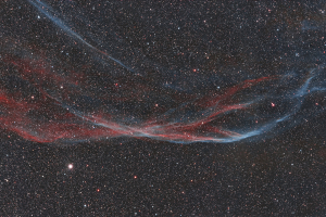 Tovább az észleléshez »A telihol átmérőjének hétszeresét kitevő területen elterülő objektum egy körülbelül 5000 évvel ezelőtti szupernóva-kitörés maradványa. A köd hivatalos NGC sorszámai: 6960, 6979, 6992 és 6995. Az igazi Fátyol-köd vagy Hattyú-ív NGC 6992 és NGC 6995 sorszám alatt fut. E két NGC objektum között két halványabb, az NGC 6979 és az NGC 6974 terül el - Pickering-háromszögnek is nevezik őket. A két felvételsorozat nem fedi le a teljes területet. A felvételsorozat 2022. augusztus 26 és szeptember 2 között készült Baader Ha és OIII szűrőkkel.